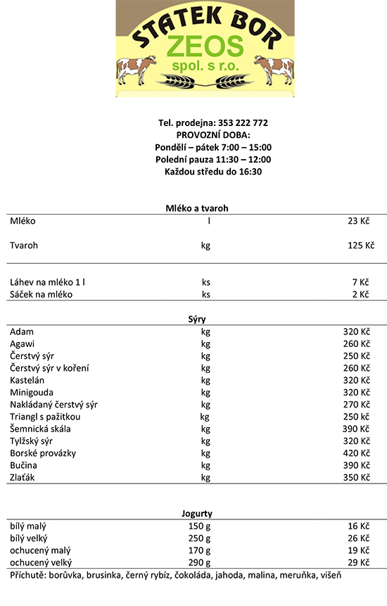 Statek Bor Zeos, spol. s r.o. si vyhrazuje právo na úpravu cen